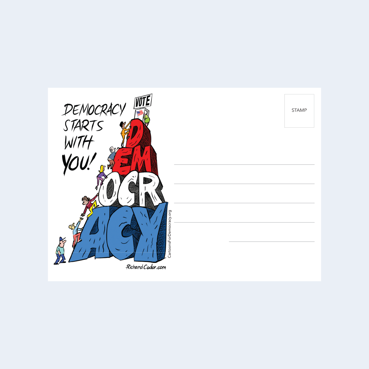 Regular shipping is included in the price, expedited shipping may cost extra. The price listed for represents your donation to Cartoons for Democracy in exchange for the postcards. You must be a U.S. citizen or lawfully admitted permanent resident (i.e., green card holder), at least 18-years-old, and not a federal contractor.