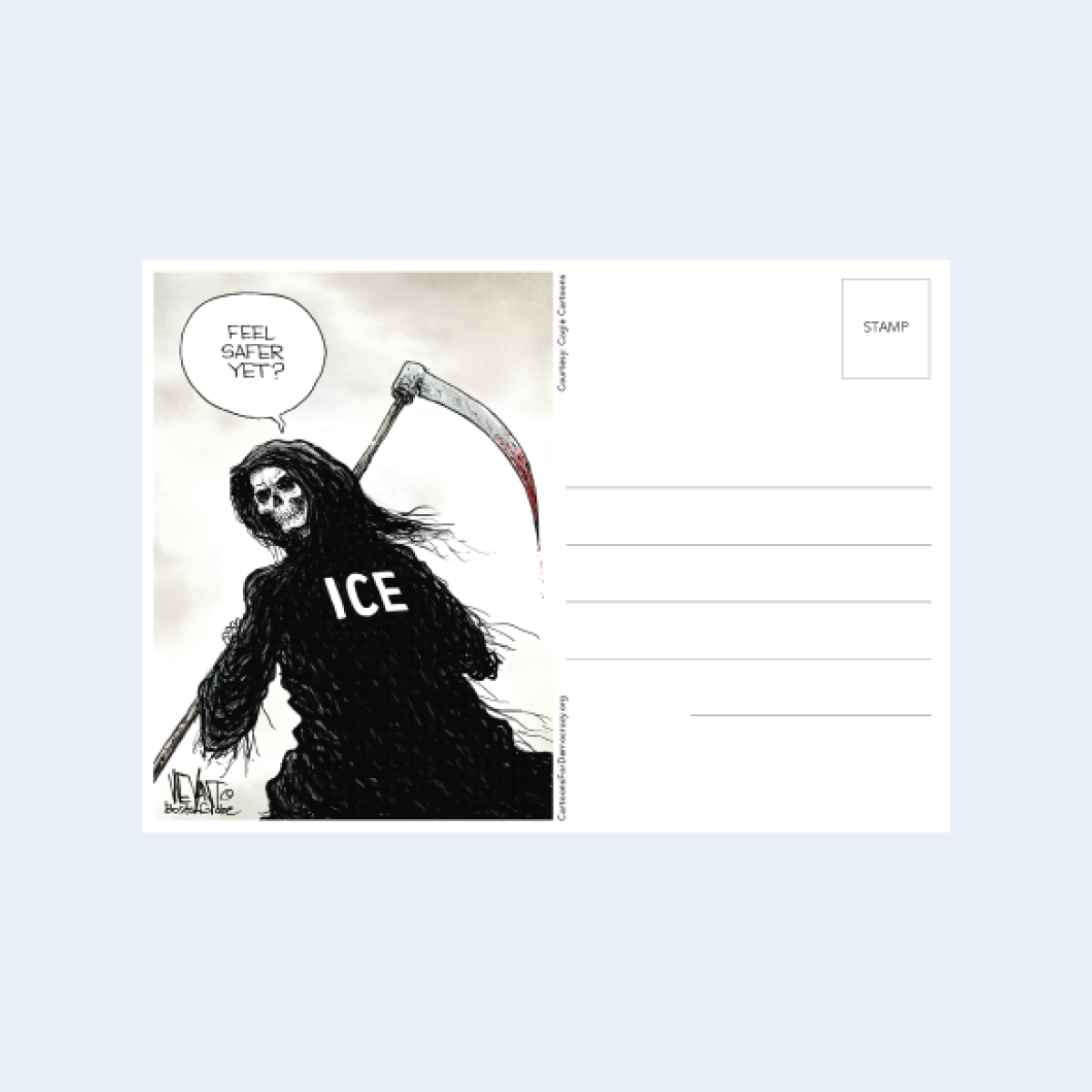 Cartoons about the catastrophic behavior of ICE are difficult to use in the context of GOTV postcards. Often they are simply too graphic, to specific to a single event, or the humor pulls away from the magnitude of the issue. Taken from his cartoon "Feel Safer Yet?" by Christopher Weyant (courtesy Cagle Cartoons), we felt this striking image conveyed the horror of the situation, without going over a line. Recipients WILL notice this card, and turn it over to see your message.