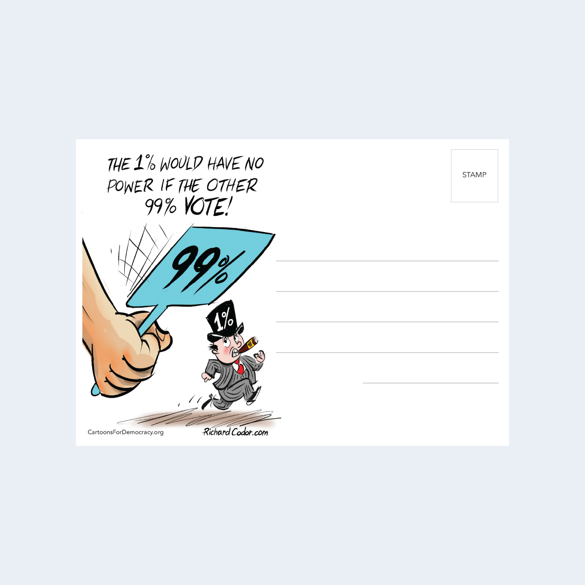 Designed by Richard Codor, this card reminds the recipient of their power if they join together and vote. This card will definitely get the attention you are looking for and will not be overlooked like so many others. The bright and fun design will both deliver a message and encourage the reader to flip the card and see your hand-written message on the back.