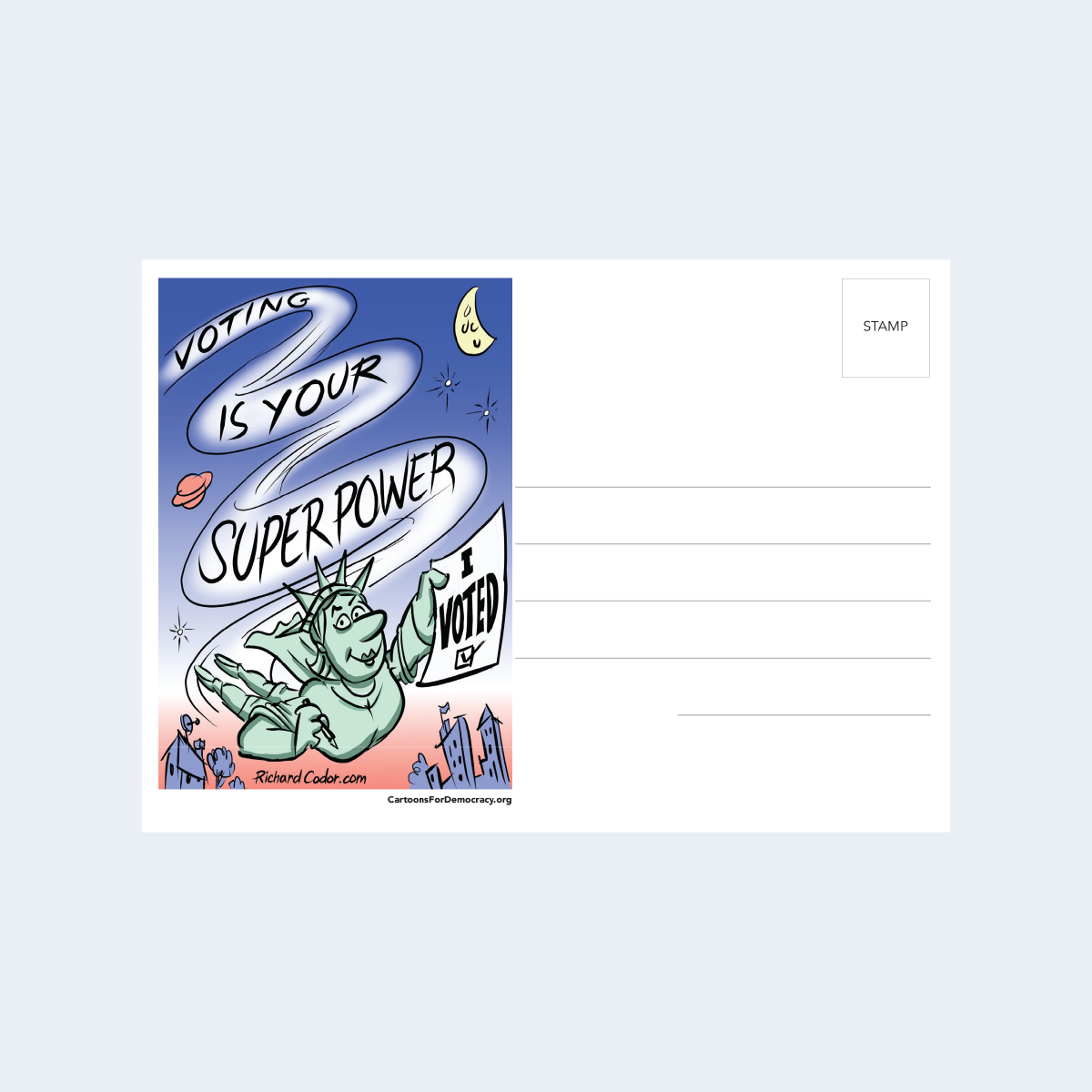 Designed by Richard Codor, this card reminds the recipient of their power if they join together and vote. This card will definitely get the attention you are looking for and will not be overlooked like so many others. The bright and fun design will both deliver a message and encourage the reader to flip the card and see your hand-written message on the back.